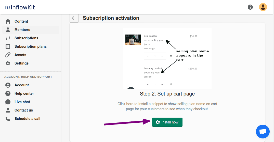 - After that, back on the activate settings in step 2, click on Install now to setup the cart page.
