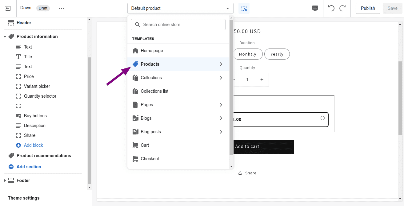 - Then select Default product. On the left side, a side menu will appear. Click Add block as shown below