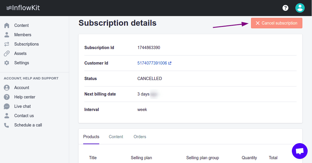 On the subscription details page, you can see the customer id, next billing date, items bought by this customer the content and billing attempts. To cancel this subscription, click Cancel subscription button on the top right corner.