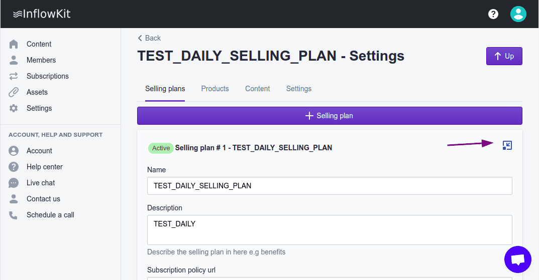 - On the selling plans tab, click the icon on the top left corner to expand the card & update any details as required.