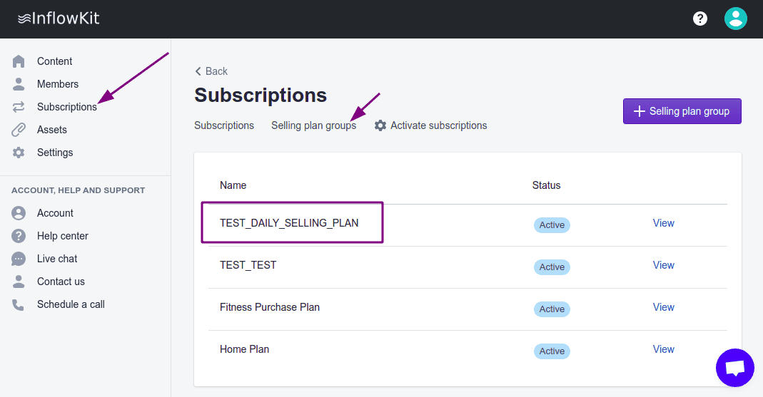 - On the left side menu click Subscriptions and on the Selling Plan groups Tab, select the selling plan group you’d like to a purchase option to.
